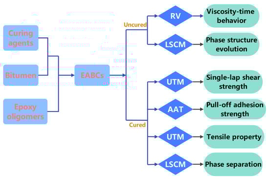 We engineered epoxy asphalt bond coats with three distinct phase structures: bitumen-continuous, co-continuous, and epoxy-continuous. A laser scanning confocal microscope (LSCM) tracked structural evolution, while a Brookfield rotational viscometer (RV) captured viscosity–time dependencies. Mechanical performance (tensile properties, single-lap shear, and pull-off adhesion) was quantified using a universal testing machine (UTM) and an automatic adhesion tester (AAT). Bond failure mechanisms between EABCs and steel substrates were also analyzed. Figure 1 illustrates a flow chart of EABC preparation and characterization.