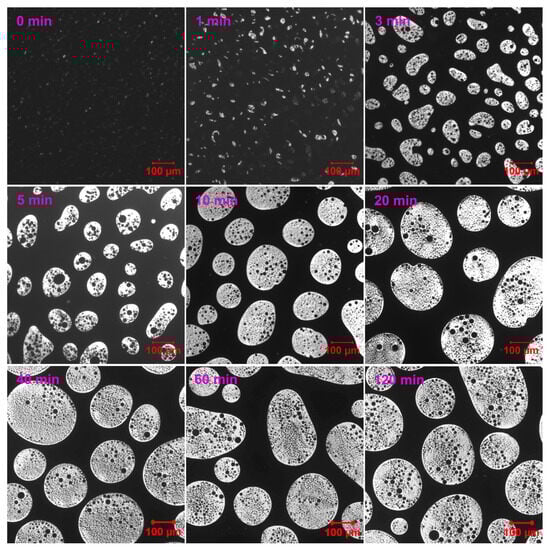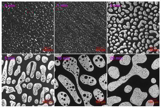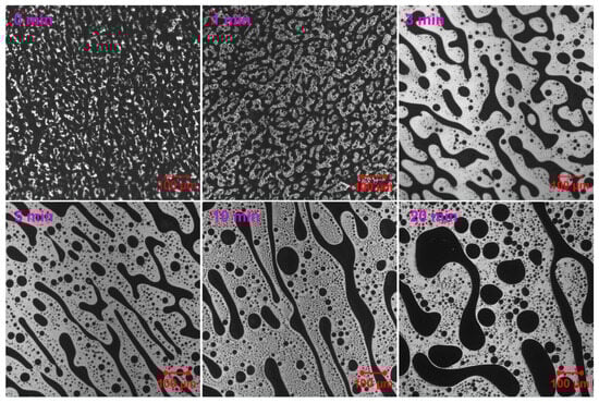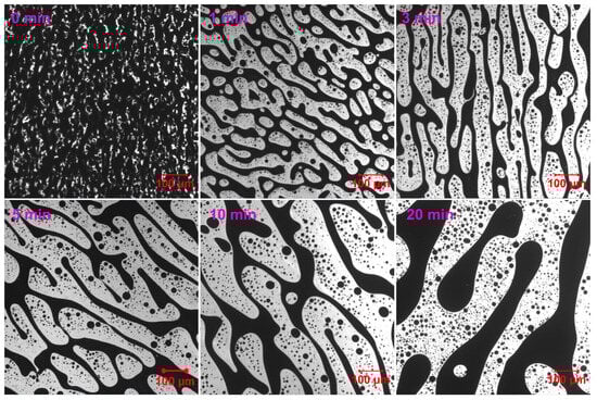 Figure 3 demonstrates the phase evolution of EABC with 41 vol.% ER (EABC41) at 120 °C. Rapid curing initially induces reaction-induced phase separation, evidenced by discrete white epoxy particles in the continuous black bitumen phase at t = 0 min [52]. During subsequent curing: (a) epoxy domains progressively coalesce and increase in size (a nucleation and growth [NG] phase separation mechanism [53]); (b) particle morphology transitions from irregular to spheroidal; and (c) bitumen sub-inclusions become encapsulated within epoxy droplets. This hierarchical “double emulsion” structure mirrors phenomena in both oil/water emulsions [54] and polymer blends [55,56].
