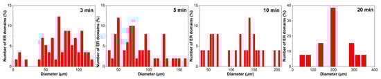 Figure 4 illustrates the particle size distribution of ER within the continuous bitumen phase of EABC41 during phase evolution at 120 °C. After 3 min of curing, the majority of ER particles are distributed in the 50–100 μm range. As the curing progresses, the particle size distribution expands to broader ranges: 50–150 μm at 5 min and 50–200 μm at 10 min. Following 20 min of curing, the particle size is concentrated predominantly at 200 μm.