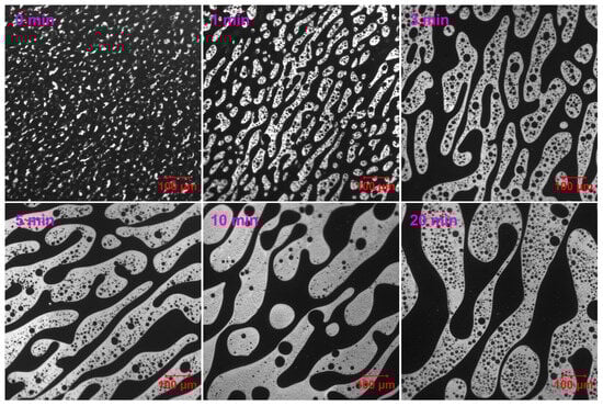 Compared to EABC42, EABC with 43 vol.% ER (EABC43) demonstrates enhanced phase contrast with significantly brighter ER domains during initial curing (Figure 6). Following 1 min of thermal treatment at 120 °C, the co-continuous phase in EABC43 propagates progressively with extended curing duration. Remarkably, this co-continuous architecture persists intact even after 20 min of curing.