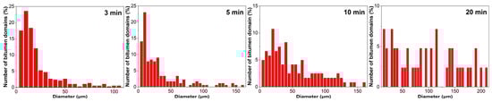 Figure 10 characterizes the size distribution evolution of bitumen domains in EABC46 during thermal curing at 120 °C. At 3 and 10 min, the distributions are predominantly confined to smaller diameters (5–30 μm and 5–40 μm, respectively). With progressive curing, the distribution broadens toward larger diameters after 10 and 20 min, spanning 5–130 μm and 5–210 μm, respectively.