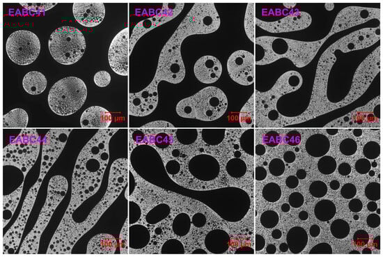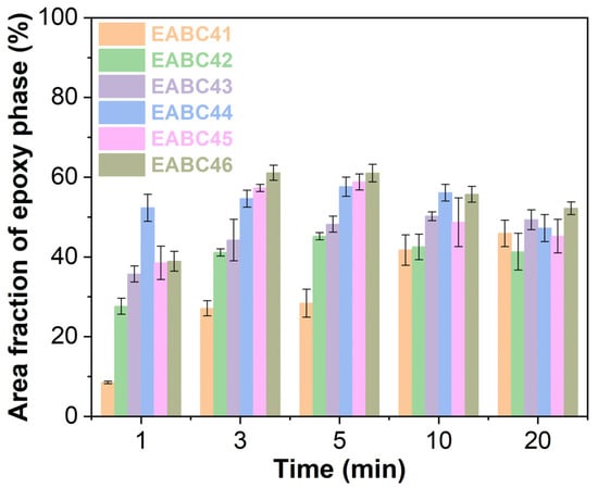Figure 11 shows the evolution of epoxy phase area fractions in EABCs during curing at 120 °C. In epoxy-dominated and initial co-continuous structures (EABC41–43), the epoxy phase area fraction exhibits a continuous increase with curing time. For later co-continuous and bitumen-dominated morphologies (EABC44–46), the epoxy phase area fraction initially increases, reaching a maximum value at 5 min, after which it shows a slight decrease with further curing time.