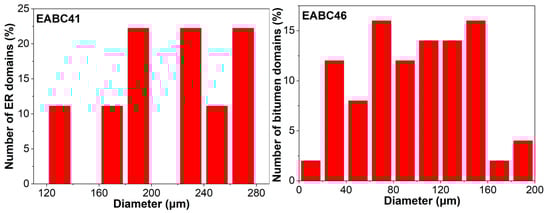 Figure 13 compares domain size distributions between epoxy domains in cured EABC41 (bitumen-continuous matrix) and bitumen domains in cured EABC46 (epoxy-continuous matrix). Epoxy domains in the thermoplastic bitumen matrix range from 120 to 280 μm, while bitumen domains in the crosslinked epoxy matrix are significantly smaller (30–150 μm). This size reduction demonstrates that the crosslinked epoxy network more effectively constrains domain growth than the non-crosslinked bitumen matrix after phase inversion.