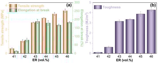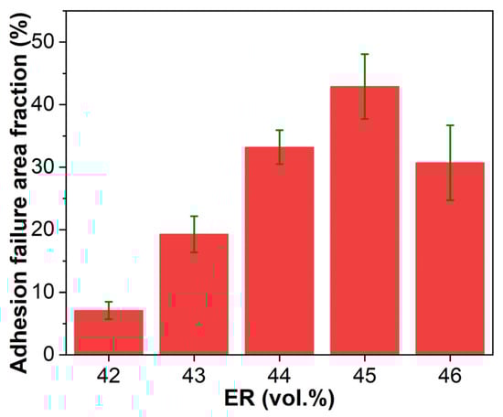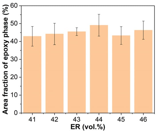 Figure 14 illustrates the epoxy phase area fractions in cured EABCs. The area fraction initially rises with increasing ER concentration from 41 to 44 vol.%, then declines at 45 vol.% before showing a minor rebound at 46 vol.%.