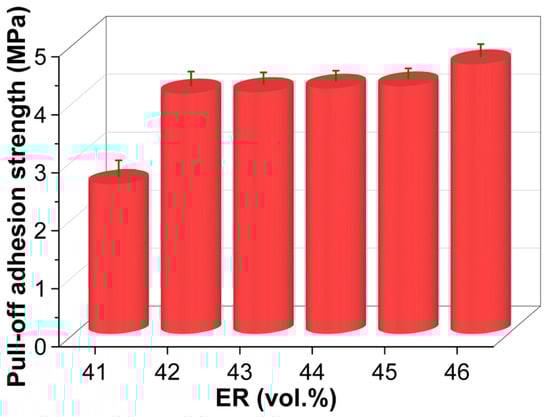 Figure 16 shows the pull-off adhesion strength of cured EABC materials. Similar to tensile properties, the bitumen-continuous systems exhibit a 60% increase in pull-off adhesion strength when the ER content rises from 41 to 42 vol.%. However, the microstructural transition from a bitumen-continuous to a co-continuous structure does not yield a significant improvement. A gradual enhancement in pull-off adhesion strength is observed with increasing ER concentration across the full phase transition spectrum, from a bitumen-continuous to a co-continuous and then to an epoxy-continuous structure (EABC42–EABC46). Notably, compared to EABC41, the pull-off adhesion strengths of EABC43 and EABC46 are significantly higher by 61% and 80%, respectively.