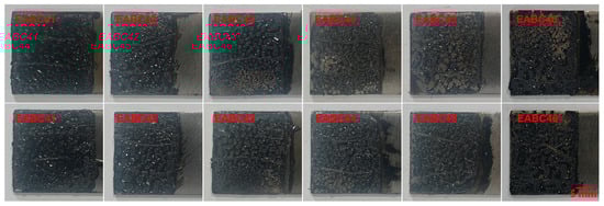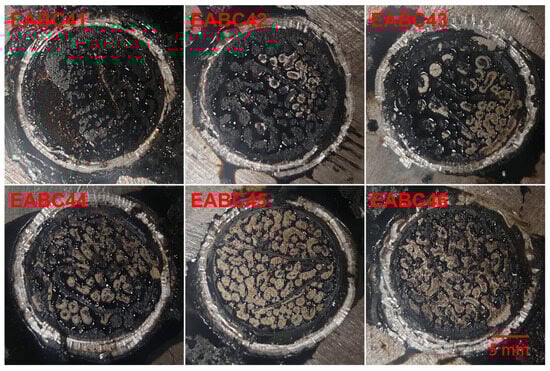 Figure 18 presents the adhesive failure area fractions on steel adherends after pull-off adhesion testing. For EABCs with bitumen-continuous through co-continuous structures (EABC42–EABC45), the adhesive failure area fraction increases with ER concentration due to the expansion of continuous epoxy components, which have superior bonding capability compared to bitumen. However, EABC46 with a continuous epoxy phase exhibits a decreased adhesive failure area, reflecting increased cohesion failure. Consequently, EABC46 achieves the highest pull-off adhesion strength among all systems, measuring 80% higher than EABC41 with a continuous bitumen phase.