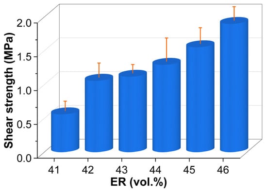Figure 19 illustrates the single-lap shear strength of cured EABCs. Like pull-off adhesion strength, shear strength exhibits a dramatic 89% increase when ER concentration rises from 41 vol.% to 42 vol.%. Beyond 42 vol.%, shear strength progresses steadily with increasing ER concentration, though the rate of growth between consecutive concentrations exceeds that of pull-off adhesion strength (Figure 16). Compared to EABC41, EABC43 and EABC46 show 99% and 240% higher shear strength.