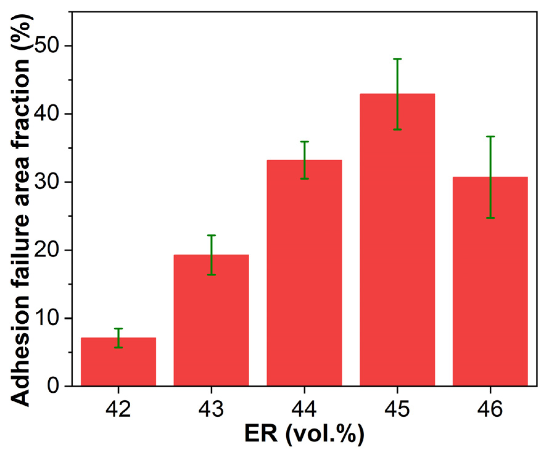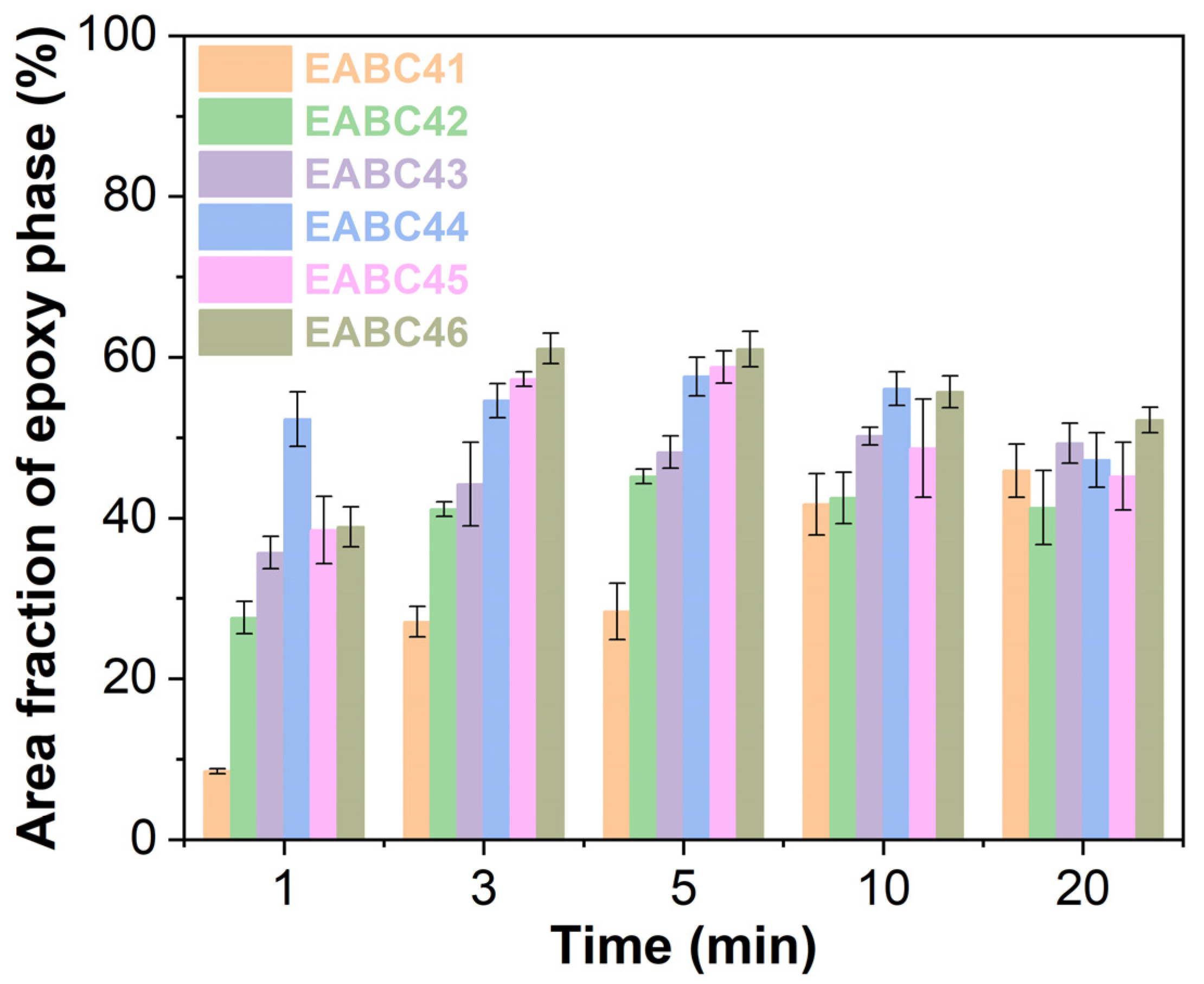 - The phase microstructure development follows three distinct stages: epoxy-dispersed morphology in a continuous bitumen matrix via a nucleation and growth mechanism (41–42 vol.% ER), co-continuous morphology (43–45 vol.% ER), and bitumen-dispersed morphology in continuous epoxy networks (46 vol.% ER). Notably, EABC42 represents a transitional structure between epoxy-dispersed and co-continuous configurations.