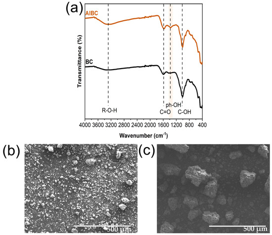 As shown in Figure 1b,c, both BC and AlBC exhibited considerable morphological heterogeneity, consisting of irregular, non-spherical particles. Notably, AlBC particles had a rougher surface, which may enhance its adsorptive capacity, and a larger particle size compared to BC. This observation is further supported by a particle size analysis, which revealed DX50 values of 8.19 µm and 24.1 µm for BC and AlBC, respectively. The increase in size was likely due to the agglomeration of smaller particles during the activation process. Although alkaline treatment of biochar has been widely used as a modification method [42,43,44,45], there are very few studies on its effect on particle size. Liu et al. [46] and Yang et al. [47] utilized alkaline agents to improve their material’s adsorptive capacities for the removal of methylene blue and ammonium, respectively. As reported, an increase in the particle size of biochar was noted after treatment at the scale of a few nanometers in the first case and in a range of micrometers in the second case, as is evident from the size distribution results. These reports support the findings of this study regarding the increased particle size of biochar after treatment.