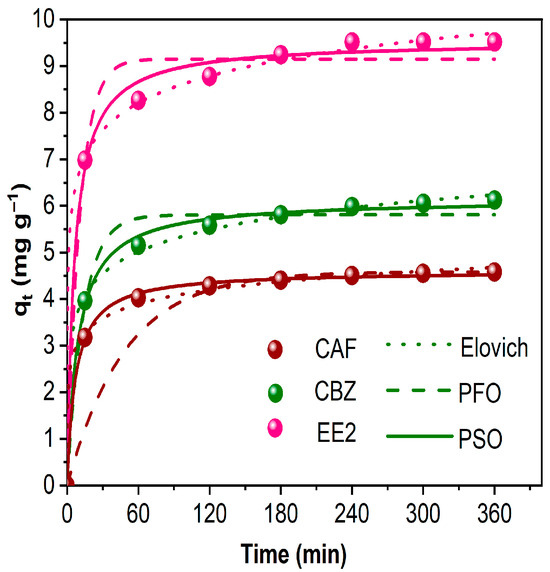 The kinetic profiles of CAF, CBZ, and EE2 adsorption onto AlBC were evaluated using three models: the Pseudo-First Order—PFO, Pseudo-Second Order—PSO, and Elovich, as depicted in Figure 2. Under the experimental conditions, all three contaminants exhibited rapid adsorption within the first 60 min, likely due to initial physical adsorption onto the biochar’s surface. After 60 min, the adsorption rate decreased, and equilibrium was reached at 360 min. This slower second phase of adsorption may be attributed to the filling of the inner pores of the biochar, as most of the available surface active sites were likely initially occupied by the contaminants.