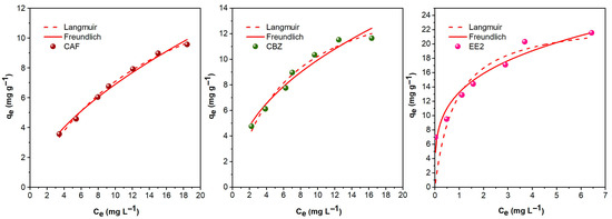 The adsorption of EE2, on the other hand, adhered to the Freundlich model, as indicated by the higher R2 values summarized in Table 2. EE2 has the most distinct properties among the studied contaminants, with a higher molecular weight and lipophilicity (high LogKow). As observed, its adsorption was higher than that of CAF and CBZ, with nearly double the qe values. These results are in agreement with those reported in the literature, where the Freundlich model best describes the experimental results compared to the Langmuir [62].