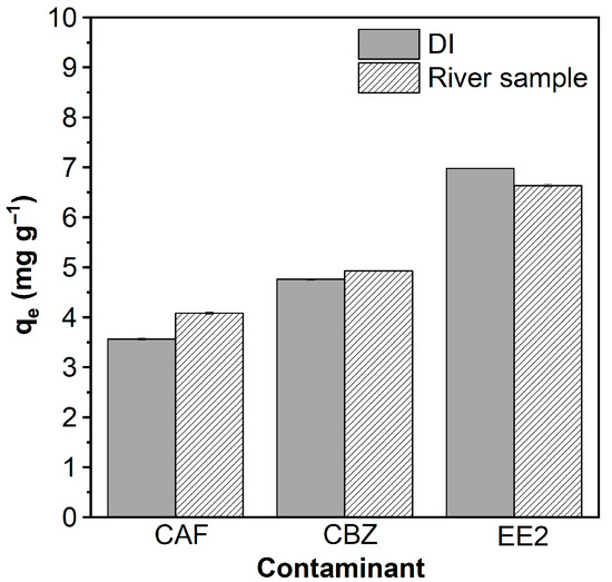 Single-contaminant adsorption tests in river water showed comparable or even improved removal efficiencies relative to those in deionized (DI) water, as illustrated in Figure 5. Specifically, the adsorption capacity for CAF increased from 3.56 to 4.10 mg g−1, while CBZ showed a slight increase from 4.75 to 4.93 mg g−1. EE2 exhibited a minor decrease, from 6.98 to 6.64 mg g−1. These promising results suggest that AlBC maintains effective performance under natural water conditions, with adsorption efficiencies similar to or slightly higher than those observed under controlled laboratory settings.