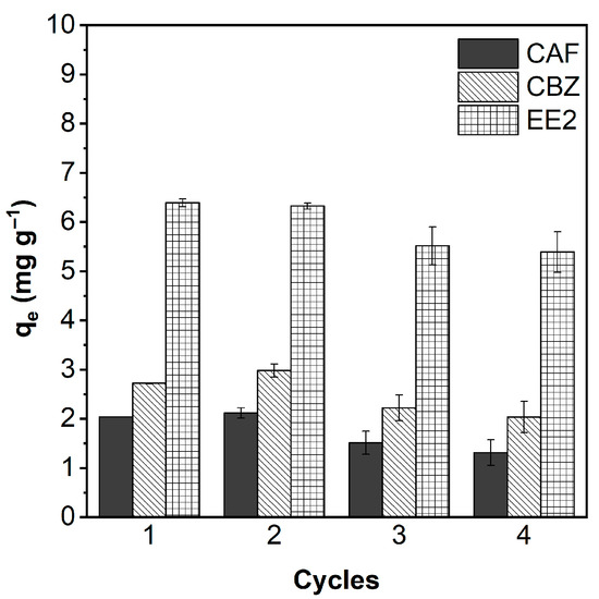 The reusability of AlBC is a critical parameter for evaluating its long-term stability and feasibility in wastewater treatment applications. To assess this aspect, adsorption experiments were carried out under optimal conditions with the simultaneous presence of CAF, CBZ, and EE2. After each adsorption cycle, AlBC was recovered by filtration and thoroughly washed with ethanol and deionized water to remove loosely bound contaminants [75], then reused in a subsequent cycle. This process was repeated for four consecutive cycles, and the results are shown in Figure 6.