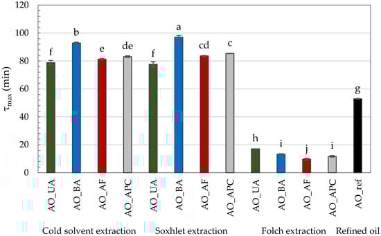 PDSC oxidation time (τmax) of commercial and self-extracted almond oils, where: AO_UA—oil extracted from unpeeled almonds; AO_BA—oil extracted from blanched almonds; AO_AF—oil extracted from almond flakes; AO_APC—oil extracted from almond protein concentrate; AO_ref—commercial, refined oil. Lowercase letters (a–j) indicate a significant difference at the significance level of 0.05 (Tukey HSD).