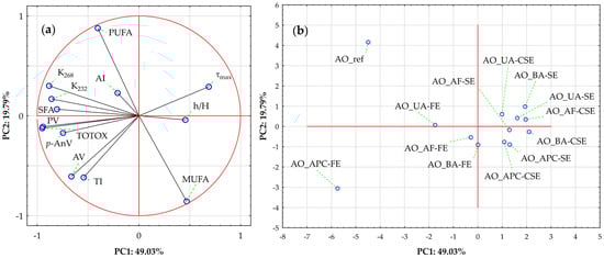 Principal component analysis (PCA) of almond oils based on lipid stability indices and fatty acid profiles. (a) Loading plot for PC1 vs. PC2; where symbol designations are as in Figure 2. (b) Score plot showing sample distribution on PC1 vs. PC2; where symbol designations are as in Figure 3.