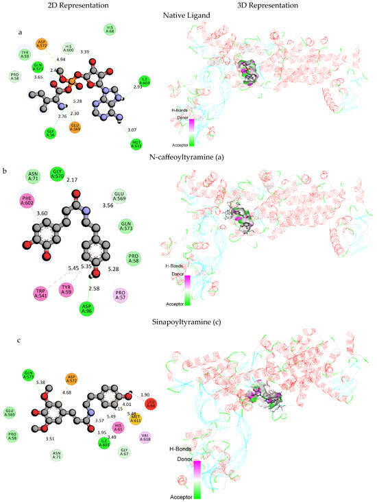 2D and 3D representations of selected compounds (a) with native ligand (b) N-caffeoyltyramine and (c) sinapoyltyramine.