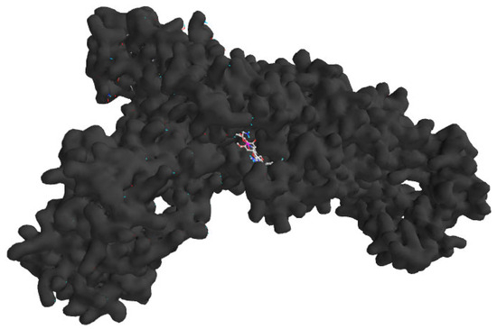 In order to enhance the precision of the docking process, the authors carefully defined the grid box centered on the active site at coordinates such as X: 9.052774, Y: 16.410774, and Z: −1.715387. The PyRx virtual screening tool was utilized, in which all the ligands were fed as input, including the native ligand, and the docking assays were performed. This approach allowed for a comprehensive evaluation of the potential binding modes and affinities. The resulting poses were meticulously analyzed based on the binding affinity scores and protein–ligand interactions, with the highest-scoring conformations selected for further investigation. To visualize and interpret the docking results, Biovia Discovery Studio was utilized, which enabled a detailed examination of the molecular interactions between the ligands and the H. pylori isoleucyl-tRNA synthetase. Figure 1 shows a 3D ribbon representation of the enzyme complexed with its native ligand, which offers a clear visual understanding of the binding mode and key interactions. This rigorous molecular docking approach provides valuable insights about the potential binding mechanisms of various ligands to the H. pylori isoleucyl-tRNA synthetase. Thus, it lays a solid foundation for the structure-based drug design and the development of novel H. pylori isoleucyl-tRNA synthetase inhibitors.