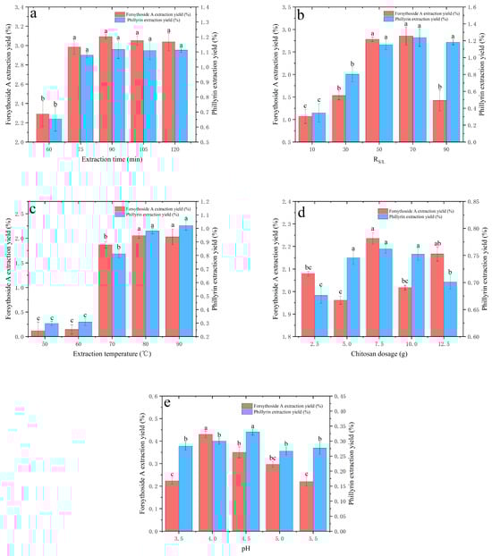 Chitosan-assisted extraction single-factor influence diagram. (a) Extraction time; (b) solid–liquid ratio (RS/L); (c) extraction temperature; (d) chitosan dosage; and (e) extraction pH. Data are expressed as the mean ± SD of n = 3 samples. Different lowercase letters (a, b, and c) in the same figure indicate statistically significant differences (p < 0.05).