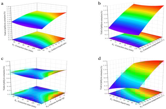 As illustrated in Figure 3, the extraction temperature (X3) was the most significant factor influencing the yield of phillyrin. The interactive effects of the parameters on the extraction yield are evident in Figure 2b,d, where the chitosan dosage (X4) is held constant at its zero level. Specifically, when both the extraction time (X1) and the solid-to-liquid ratio (X2) were maintained at lower levels, the yield of phillyrin increased markedly with a rise in the extraction temperature (X3).