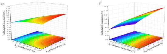 Three-dimensional response plots of the interaction effect of the parameter variables of phillyrin on the extraction efficiency. (a) Interaction of the extraction time with RS/L; (b) interaction of the extraction time with the extraction temperature; (c) interaction of the extraction time with the chitosan dosage; (d) interaction of RS/L with the extraction temperature; (e) interaction of RS/L with the chitosan dosage; and (f) interaction of the extraction temperature with the chitosan dosage.