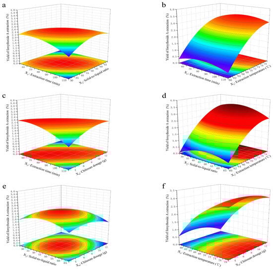 Three-dimensional response plots of the interaction effect of the parameter variables of forsythoside A on the extraction efficiency. (a) Interaction of the extraction time with RS/L; (b) interaction of the extraction time with the extraction temperature; (c) interaction of the extraction time with the chitosan dosage; (d) interaction of RS/L with the extraction temperature; (e) interaction of RS/L with the chitosan dosage; and (f) interaction of the extraction temperature with the chitosan dosage.