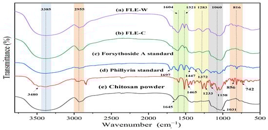 FT-IR spectra of (a) water extract of Forsythia suspensa leaves (FLE-W), (b) chitosan-assisted extract of Forsythia suspensa leaves (FLE-C), (c) forsythoside A standard, (d) phillyrin standard, and (e) chitosan powder.