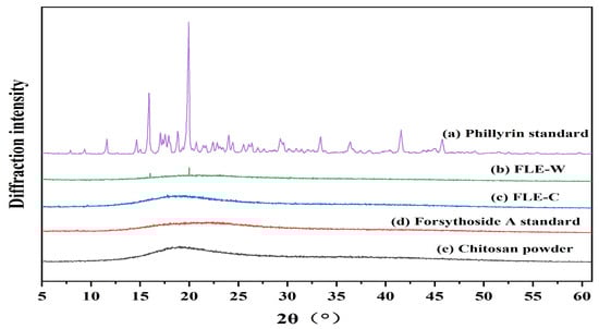 Powder XRD diffractogram of (a) phillyrin standard, (b) water extract of Forsythia suspensa leaves (FLE-W), (c) chitosan-assisted extract of Forsythia suspensa leaves (FLE-C), (d) forsythoside A standard, and (e) chitosan powder.
