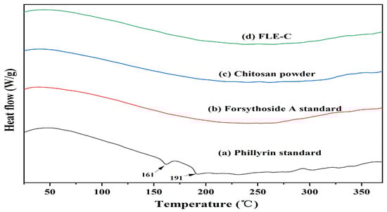 DSC result of (a) phillyrin standard, (b) forsythoside A standard, (c) chitosan powder, and (d) chitosan-assisted extract of Forsythia suspensa leaves (FLE-C).