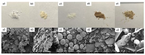 The powder state of the sample and the microstructure observed by SEM. The samples photos are (a1) phillyrin standard, (b1) forsythoside A standard, (c1) chitosan powder, (d1) FLE-W, (e1) FSE-C and the SEM images of samples are (a2) phillyrin standard, (b2) forsythoside A standard, (c2) chitosan powder, (d2) FLE-W, (e2) FSE-C.