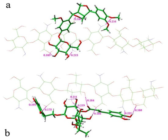 Molecular docking results: (a) phillyrin–chitosan (n = 4); (b) forsythoside A–chitosan (n = 4).