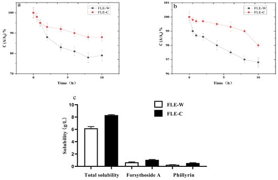 The solubility of the Forsythia suspensa leaves extracts obtained through aqueous (FLE-W) and chitosan-assisted (FLE-C) extraction is presented in Figure 10c. Upon reaching supersaturation in an aqueous solution at room temperature, the solubility of FLE-C was determined to be 8.32 ± 0.27 g/L, significantly higher than that of FLE-W, which was 6.19 ± 0.35 g/L. This enhancement was further corroborated at the individual compound level. In the FLE-C solution, the concentrations of forsythoside A and phillyrin reached 1.06 ± 0.09 g/L and 0.56 ± 0.06 g/L, respectively. These values represent substantial increases of 58.21% and 115.38% compared to their corresponding solubilities of 0.67 ± 0.06 g/L and 0.26 ± 0.03 g/L in the FLE-W solution. Collectively, these pronounced improvements in solubility provide direct evidence that chitosan interacts with the active ingredients of Forsythia suspensa leaves during the extraction process, leading to the formation of novel complexes that enhance the aqueous solubility of these bioactive compounds.