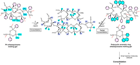 Cross-linking of melting gels with large polycyclic aromatic groups is sterically hindered compared to Ph silsesquioxane melting gels. Can post-cross-linking lead to consolidated structures?