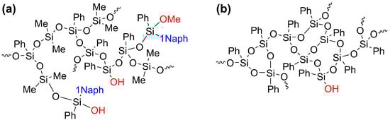 In earlier work, we synthesized siloxane/silsesquioxane hybrids via acid-catalyzed condensation of methyl-, phenyl-, and polycyclic aromatic-substituted alkoxysilanes. These materials exhibited high RIs, excellent thermal stability, and high optical transparency [12]. We also observed that the isomerism of naphthyl groups (1- vs. 2-naphthyl) influenced excimer formation, thermal stability, and glass transition temperature (Tg), but had minimal impact on RI. Despite these advantages, prolonged thermal exposure led to yellowing and partial liquefaction, rendering the materials unsuitable for high-temperature applications. These include LED encapsulation, where temperatures may exceed 120 °C [29], protective coatings [30], electrical insulation for cables [31] and insulation casing for rocket cases [32]. This thermal instability appears to be specific to systems containing polycyclic aromatic substituents, as phenyl-based analogs consolidate into hard materials. However, even phenyl-rich systems can exhibit reduced cross-linking due to steric hindrance and a lower density of bridging oxygens, which increases the consolidation temperature [28,33]. These observations suggest that polycyclic aromatic groups hinder complete cross-linking, preventing full consolidation.