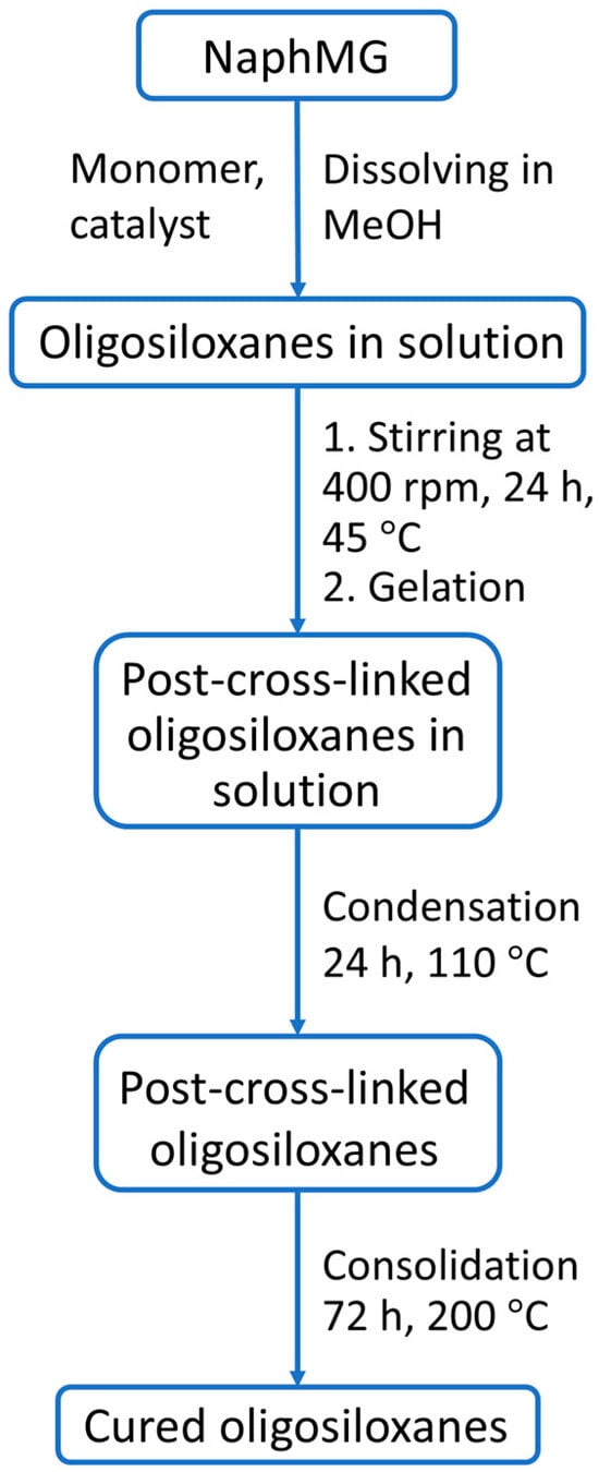 All siloxanes except for NaphMG_Sn were consolidated for 72 h at 200 °C in a drying oven to obtain the cured siloxanes. Due to its toxicity, NaphMG_Sn was consolidated for 72 h at 200 °C in a tube furnace under wet argon.