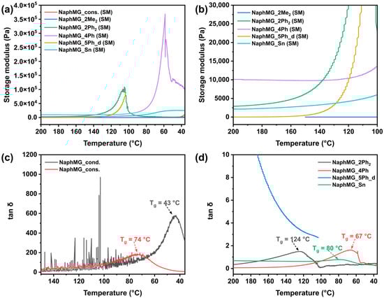 Comparing the viscosities at 200 °C (Figure S3 and Table S1) NaphMG_4Ph shows the highest values by far, followed by NaphMG_2Ph2, NaphMG_Sn and NaphMG_5Ph_d. The same trend was observed for the storage modulus (Figure 4a,b). NaphMG_4Ph reaches the highest rubbery plateau of all samples already at around 130 °C, followed by NaphMG_Sn reaching the third highest plateau at 160 °C and NaphMG_2Ph2 reaching the second highest plateau at around 190 °C, while NaphMG_5Ph_d does not reach a rubbery plateau at all, which shows that the former three keep their elasticity at high temperatures and form a cross-linked structure [43,47]. This was also confirmed during the thermal treatment experiment. Interestingly, NaphMG_Sn did turn liquid during this experiment either because it has the lowest elastic modulus of the three samples reaching a rubbery plateau or because the thermal treatment experiment was done with grinded samples instead of tablet-shaped and compressed samples as in the DMA.