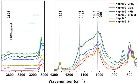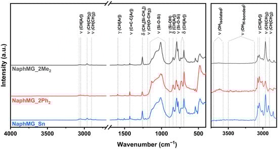 FTIR spectroscopy was performed on all samples as an additional characterization method to further study their condensation behavior, as well as the remaining hydroxy and methoxy groups (Figure 6 and Figure S26 and Table S3). Besides the aromatic groups and the methyl groups, the Si-O-Si stretching vibration is represented by two absorption bands, one from 1131 cm−1 to 996 cm−1 and the other one at 798 cm−1, indicating a successful network formation. This is further supported by the missing band of the methoxy groups at 1188 cm−1 [21,53,54]. During the condensation process, hydrolyzed species play an important role. Therefore the absorption bands at 3712 cm−1 to 3575 cm−1 (ν(OHisolated)), 3500 cm−1 to 3120 cm−1 (ν(OHH-bonded)) and 920 cm−1 to 890 cm−1 (ν(Si-OH)) are of great importance [53,55]. After the consolidation with additives, there are no hydrogen-bonded hydroxyl groups (3500-3120 cm−1) visible, indicating that the condensation is finished [12,25]. Comparing all samples, only NaphMG_2Me2 and NaphMG_Sn show no isolated OH groups anymore, leading to the assumption that these have the highest DOC. For NaphMG_2Me2, this can be attributed to electronic and steric effects also mentioned in the last chapter [50,56]. NaphMG_Sn was further condensed with an organotin catalyst, which is known for room temperature vulcanizing (RTV) of siloxanes and therefore could explain the better condensation. In summary, the FTIR spectra show a successful condensation of all samples supporting the 13C CP-MAS NMR results.
