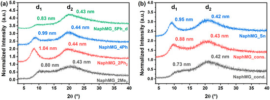 We applied PXRD measurements to obtain additional insight into the intra- and intermolecular spacing of our partly ladder-like structured siloxanes [17]. Two main peaks are identified in such polymers, one around 7° 2θ (d1), corresponding to the chain-to-chain distance, and a second one around 19° 2θ (d2) that is attributed to the intra-chain distance or the average thickness of the ladder. The ratio of their heights (R = I(d1/d2)) indicates the structural regularity of the ladder-like siloxane, which increases for higher d1 values [17,58,59]. All samples were measured in one piece without being pulverized (Figure 8, Figures S27 and S28). The first reflex increases from NaphMG_cond. to NaphMG_cons. to NaphMG_Sn. This shows an ongoing consolidation process, which leads to more Si-O-Si bonds by condensing free hydroxy and methoxy groups, thereby decreasing irregularities. For the former two, this was already seen via the DOC in the NMR spectra. The increasing DOC during the consolidation process leads to a denser and more rigid structure, resulting in an increase in d1 from 0.73 to 0.95 nm for these three samples. Masai et al. and Klein et al. for example also use a condensation method in which an acid is added first, followed by a base to complete hydrolysis and further cross-linking [26,60]. An increase in d1 from 0.80 to 1.04 nm, as well as in its intensity from NaphMG_2Me2 to NaphMG_2Ph2 indicates an increase in structural regularity and rigidity due to higher phenyl content, possibly due to π-π stacking. In addition to the IR spectra, where the increasing phenyl group content showed more ladder-like structures and therefore a higher structural regularity this time a clear trend can be seen. NaphMG_2Ph2 shows the highest regularity, followed by NaphMG_4Ph, while NaphMG_5Ph_d displays almost no regularity despite having the same number of aryl groups. It seems that structural regularity decreases if high amounts of PTMS are reacted at once as well as with increased cross-link density. The corresponding d1 positions of these three samples show the same trend indicating a denser, more rigid structure, which also gets supported by the NMR spectra showing an increasing DOC from NaphMG_5Ph_d to NaphMG_4Ph. The values of the d2 reflexes of all samples representing the intra-chain distance or thickness of the ladder are almost identical, which was to be expected, considering the ladders are always comprised of Si-O-Si bonds. In summary, the PXRD measurements show that the regularity of the siloxanes seems to increase with the amount of phenyl groups but decreases with cross-link density, at least when the same number of phenyl groups is present. Furthermore, adding PTMS to an existing siloxane seems to increase the regularity compared to adding all monomers at the start.