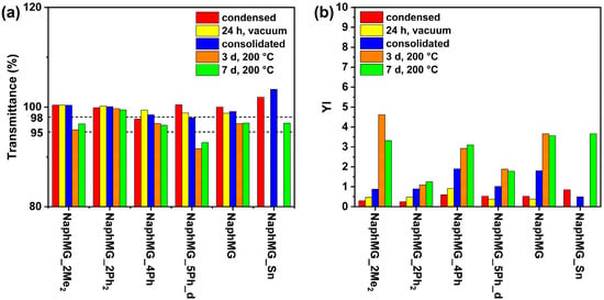 We studied the thermal stability and optical transparency of our siloxanes by measuring their transparency and yellowness index (YI) via UV-vis spectroscopy. The YI hereby describes the change from clear/white to a yellow color [61] and plays an important role regarding thermal stability, since high temperatures as well as UV light can lead to the creation of free radicals causing yellowing of the material [62]. All samples were doctor bladed onto glass slides after their condensation at a thickness of approximately 120 µm, heated in a vacuum drying oven for 24 h at 200 °C to remove any blistering, consolidated for 72 h at 200 °C and were kept for an additional 3 as well as 7 days at 200 °C in an oven (Figure 9, Figures S29 and S30). Due to the toxicity of the organotin catalyst, NaphMG_Sn was only measured after condensation, consolidation and after 7 d at 200 °C in a tube furnace (see Section 3). At 450 nm, all samples show transmittances of 98% or higher after condensation. After vacuum drying and consolidation, the transmittance for NaphMG_5Ph_d decreased the most, which can be attributed to the cracking of the sample due to its high PTMS content. In comparison, no cracks are visible for NaphMG_4Ph even though it has the same ratio of monomers. All other transmittances stayed the same or increased, which can be attributed to the shrinking of the films during consolidation. Comparing all completely heat-treated samples, apart from NaphMG_5Ph_d, those having higher phenyl ratios seem to lose less transmittance. This is consistent with the literature, according to which phenyl groups increase thermal stability in siloxanes [63,64,65]. If comparing the sample that was not further post-cross-linked (NaphMG) with the sample that was post-cross-linked using tin (NaphMG_Sn), it can be seen that the decrease in transmission of both samples after an additional 7 days at 200 °C is almost identical. The tin catalyst therefore does not appear to have a negative influence on thermal stability in terms of transmission. The YI measurements (Figure 9b) show a remarkably similar trend to the extent that samples with higher phenyl content show less yellowing, which was to be expected. Since all samples are transparent, loss in transmittance should result from yellowing. NaphMG_2Ph2, which already had the highest transparency, also shows the least yellowing. When comparing NaphMG_2Ph2 and NaphMG_4Ph with NaphMG_2Me2, NaphMG and NaphMG_Sn higher amounts of phenyl groups appear to reduce yellowing, which is consistent with higher thermal stabilities. A comparison of the samples NaphMG and NaphMG_Sn also shows an almost identical yellowness index, which again reveals that the tin catalyst does not have a negative influence on the thermal stability. In summary, the phenyl groups increase the thermal stability of siloxanes, resulting in higher transmittances and less yellowing after heat treatment. Additionally, post-cross-linking (NaphMG_4Ph) compared to reacting all monomers at once (NaphMG_5Ph_d) is beneficial not only to obtain siloxanes, which keep their elasticity at elevated temperatures but also in terms of transmittance and avoidance of cracks.