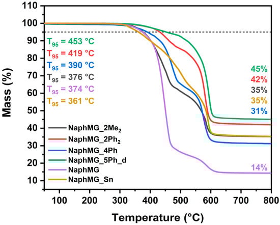 All samples show two decomposition steps. The first is around 410 to 460 °C and the second between 540 and 570 °C. Only NaphMG_Sn shows a broad first decomposition step between 310 and 500 °C. These two decomposition steps were already observed for the samples in our previous work and further analyzed via TG-FTIR measurements [12]. These studies led to the conclusion that during the first decomposition step, aromatic groups are released due to Si-C bond cleavage. During the second decomposition step, small condensed species, possibly cyclic structures, were detected. Comparing the first decomposition step for NaphMG_4Ph and NaphMG_5Ph_d, the former shows much more Si-C bond cleavage, due to different structures that may have formed, which also explains the lower T95 value.