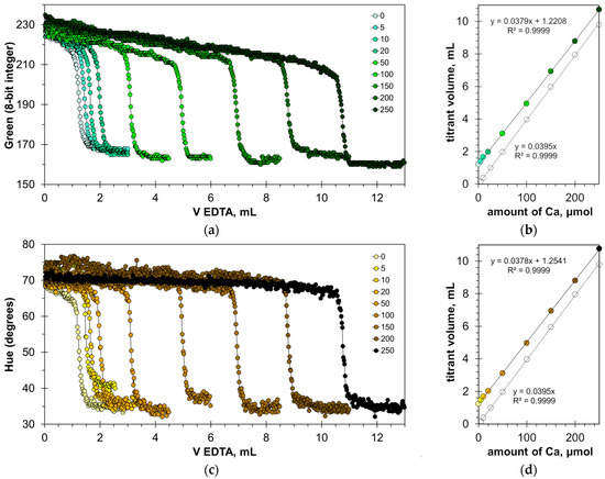 Graphs of the Green (a) and Hue (c) values vs. EDTA volume obtained in the water solution containing 1% v/v of milk with the addition of a calcium ion, using the calcein indicator of 8 μmol/L. The amounts of calcium ions are indicated in μmol. The dependences of titrant volume on calcium amount derived for Green (b) and Hue (d) signals; colorless points correspond to water solutions of calcium.