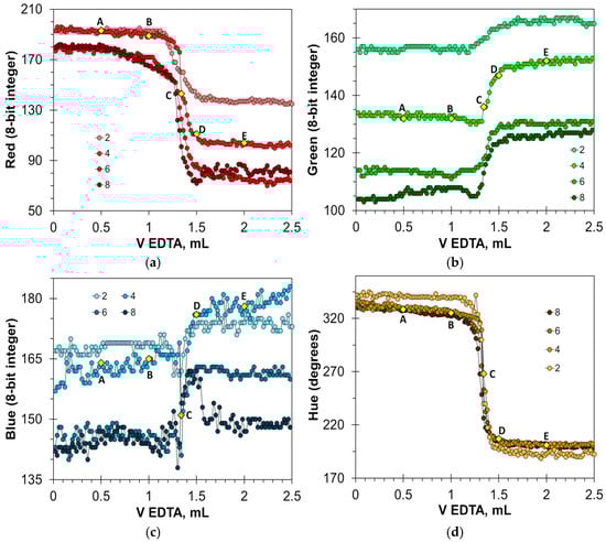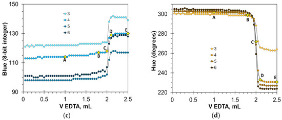 Titration graphs of calcium aqueous solution obtained using hydroxy naphthol blue as an indicator. The Red (a), Green (b), Blue (c), and Hue (d) values are plotted vs. EDTA volume. The indicator concentrations are shown in mmol/L. The amount of calcium ions is 50 μmol. Notations A–E correspond to those in Figure 4.