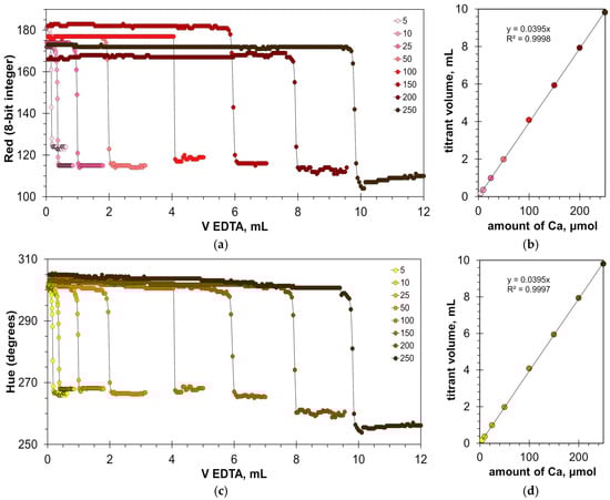 Figure 10b,d confirm that the EDTA titration has excellent linearity. The slopes are almost the same and equal to 0.0375 and 0.0376 mL/μmol for Red and Hue signals, respectively. The values of the graph shift are also very close (1.3163 mL and 1.3296 mL for the Red and Hue signals, respectively). This means that the results obtained from these signals will be consistent.