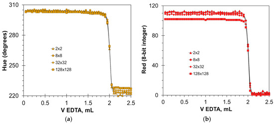 The software used allows for free selection of the color sampling area (Section 3.2). The dimensions of the sampling area have a negligible effect on the sharpness of the color transition (Figure 7). As the color sampling area increases, the titration graphs remain in the same shape, with only the Red signal drop decreasing slightly (Figure 7b). With the reduction in the color sampling area, a slight increase in fluctuations on the flat parts of the Red signal graphs is observed (Figure 7b). In the case of small sampling areas, light reflections and floating bubbles can interfere with the color signals. For this reason, the sampling area for the Red signal should not be smaller than 8 × 8 pixels.