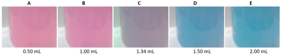 The indicator changes color from light pink (Figure 8A,B, R/G/B of 193/132/164 and 189/132/165, respectively) to light blue (Figure 8D,E, R/G/B of 111/147/176 and 104/152/178, respectively). At the endpoint of the titration, the color is rather gray-purple (Figure 8C, R/G/B of 143/136/154). This color saturation in a cloudy solution is optimal for the camera, as confirmed by the titration graphs shown in Figure 9.