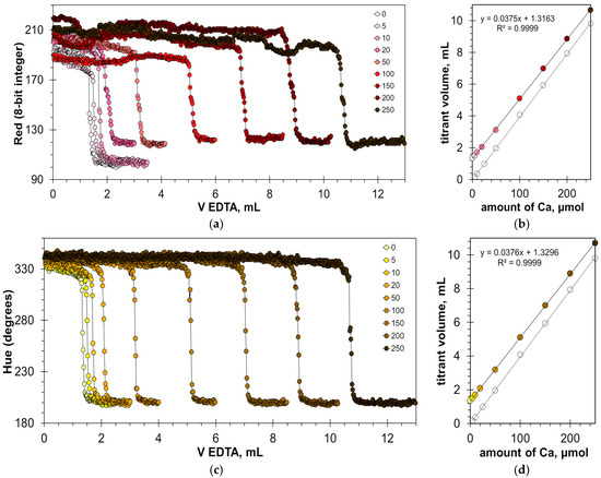 Graphs of the Red (a) and Hue (c) values vs. EDTA volume obtained in water solution containing 1% v/v of milk with the addition of a calcium ion, using the HNB indicator of 8 mmol/L. The amounts of calcium ions are indicated in μmol. The dependences of titrant volume on calcium amount derived for Red (b) and Hue (d) signals; colorless points correspond to water solutions of calcium.