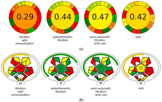 The classic method for determining calcium in dairy products according to the ISO-12081-2010 standard [27] is complexometric titration with prior mineralization. The need to prepare the sample makes this method time-consuming. As a result, the GAPI evaluation assigns low values for four criteria, indicated in Table S1, i.e., 4 (number of steps), 6 (derivatization), 8 (speed of analysis), and 11 (amount of toxic reagents). These criteria are marked in red in Figure 11a. The low scores for other parameters are related to the measurement method itself (titration), which is a manual procedure (criterion 5) and, therefore, off-line (criteria 1 and 3), requires the use of a relatively large amount of analyte (criteria 2 and 5) and generates large amounts of waste (criterion 7). The advantages of this method (marked in green) include moderate toxicity of the reagents (criteria 6 and 12) and low energy consumption (criterion 9).