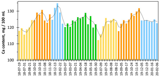 Figure 12 explains why the differences between the calcium content values measured and declared by the manufacturer can sometimes be quite significant. It seems that despite seasonal changes in calcium concentration, producers declare a constant, average amount of calcium (Table 5). A similar observation was made when examining the calcium content in mineral waters [22].
