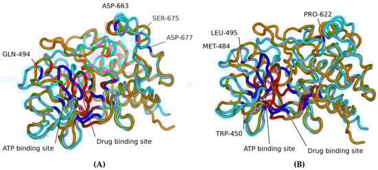 Figure 1 shows the molecular structures obtained from REST2 molecular dynamics simulations. Figure 1A shows the dabrafenib and ATP binding sites in BRAF. Figure 1B shows the vemurafenib and ATP binding sites. While the two sites have some overlapping residues, the lines point to the approximate center of each site. It is easy to note the differences between the drug-sensitive WT and drug-resistant G469A variants. It is also important to note that while the WT binds the drugs dabrafenib and vemurafenib, application of the drug does not suppress growth and proliferation due to paradoxical stimulation of the MAPK pathway [13,14].