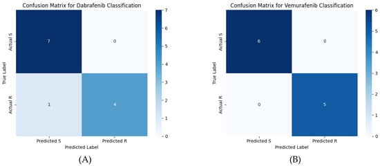 Confusion matrices for (A) the dabrafenib machine learning model and (B) the vemurafenib machine learning model. The scale bar color indicates the number of variants in each quadrant of the confusion matrix.
