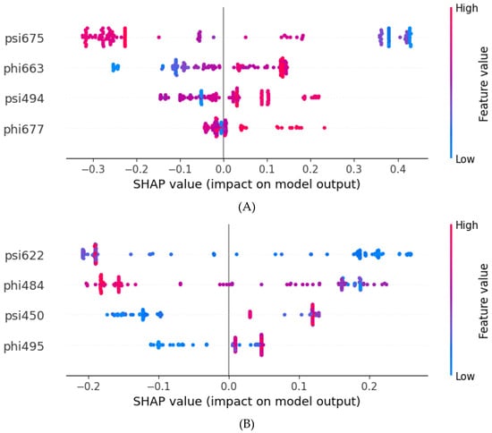 In Figure 3, the X-axis shows the SHAP values (SHapley Additive exPlanations) that indicate how strongly each feature pushes the model’s prediction toward a particular class. Positive SHAP values mean the feature drives the prediction toward the “Resistant” class (label = 1). Negative SHAP values mean the feature drives the prediction toward the “Sensitive” class (label = 0). The magnitude of the SHAP value reflects the strength of this contribution. In Figure 3, red indicates a higher feature value, while blue indicates a lower feature value. There are several pieces of information that can be inferred from the plot. For psi675, the higher values (red dots) strongly drive predictions toward “Sensitive” (negative SHAP), and the lower values (blue dots) strongly drive predictions toward “Resistant” (positive SHAP). For phi663, the lower values (blue) tend toward “Sensitive”, and the higher values (red) tend toward “Resistant”. Dihedral angles psi494 and phi677 display mixed patterns but still demonstrate clear and consistent contributions. The current SHAP analysis clearly demonstrates stable and consistent feature importance and reflects the biological and structural relevance of selected features.
